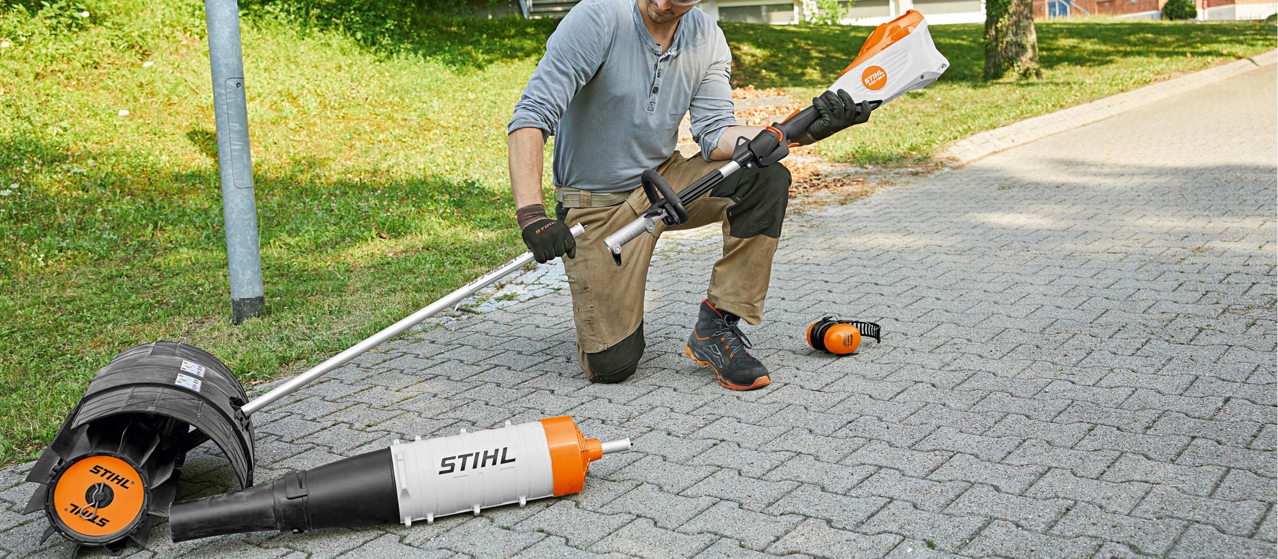 Sur les moteurs MultiSystèmes STIHL, il est possible de monter différents outils pour le travail du sol, l’entretien des pelouses ou le nettoyage des surfaces.